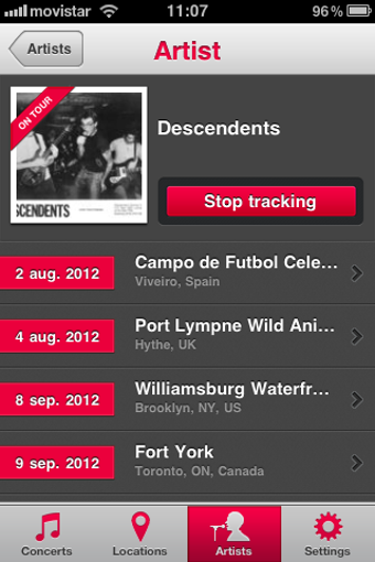 Songkick Concerts는 iPhone의 음악 라이브러리를 스캔하고 선택한 도시에서 아티스트가 언제 연주되는지 추적합니다. 아티스트가 시내에 있거나 티켓이 판매될 때 푸시 알림을 받는 옵션을 추가하여 원하는 만큼 위치를 추가할 수 있습니다. 이벤트에 회신하고 개인 이벤트 캘린더에 표시할 수 있을 뿐만 아니라 Twitter 및 페이스북. 장소 세부정보와 위치가 포함된 인앱 지도도 있습니다.